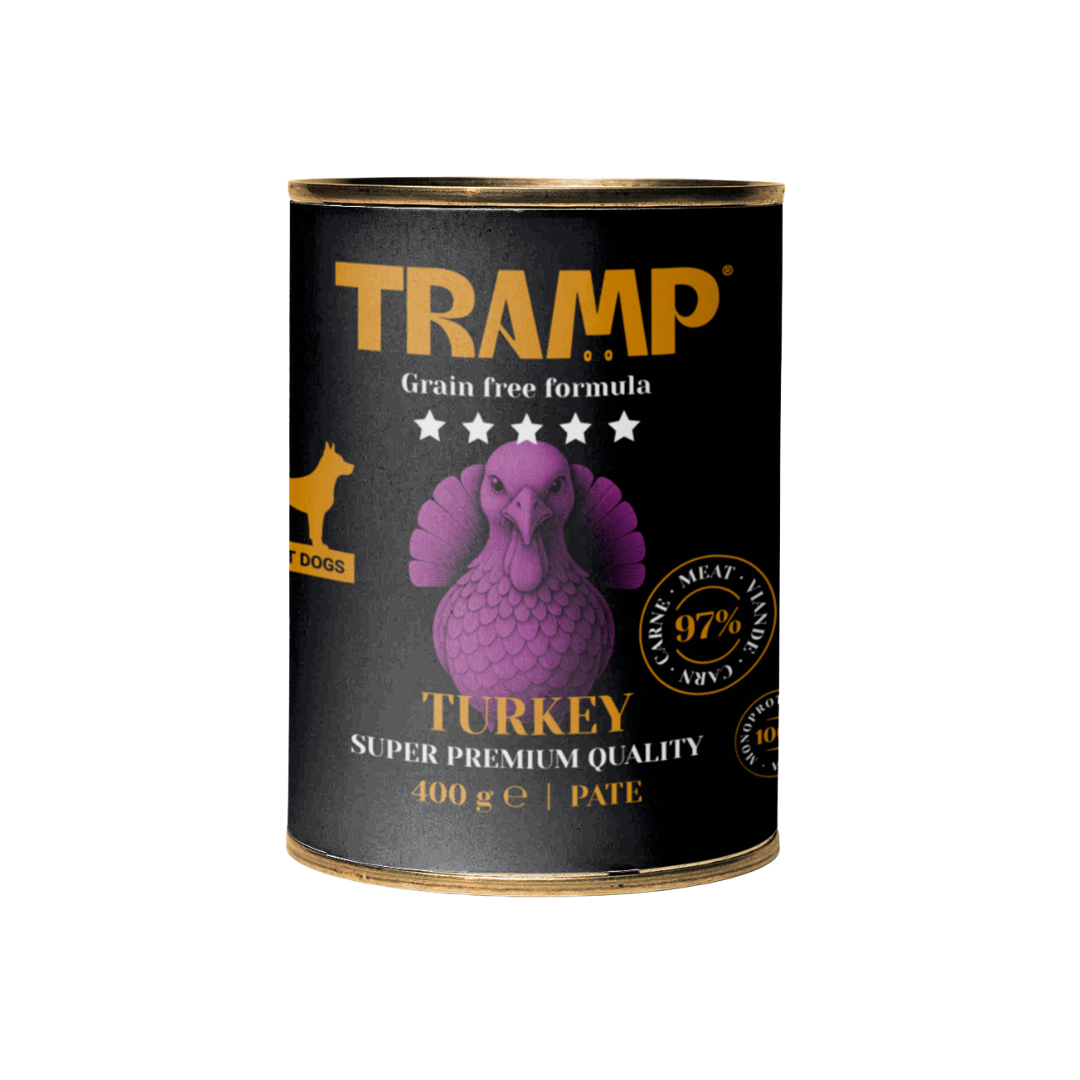 Alimento húmedo monoproteico sin cereales elaborado con Pavo (97%), aceite de girasol..